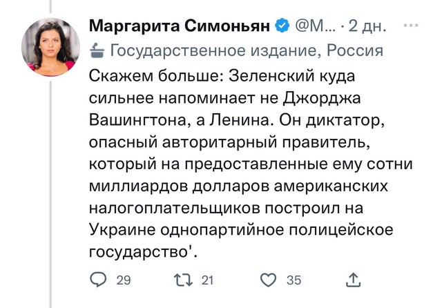 При этом сам текст - как и всё в РФ - краденое, это слова Такера Карлсона, шоумена с Fox news, известного любителя Трампа и Путина.